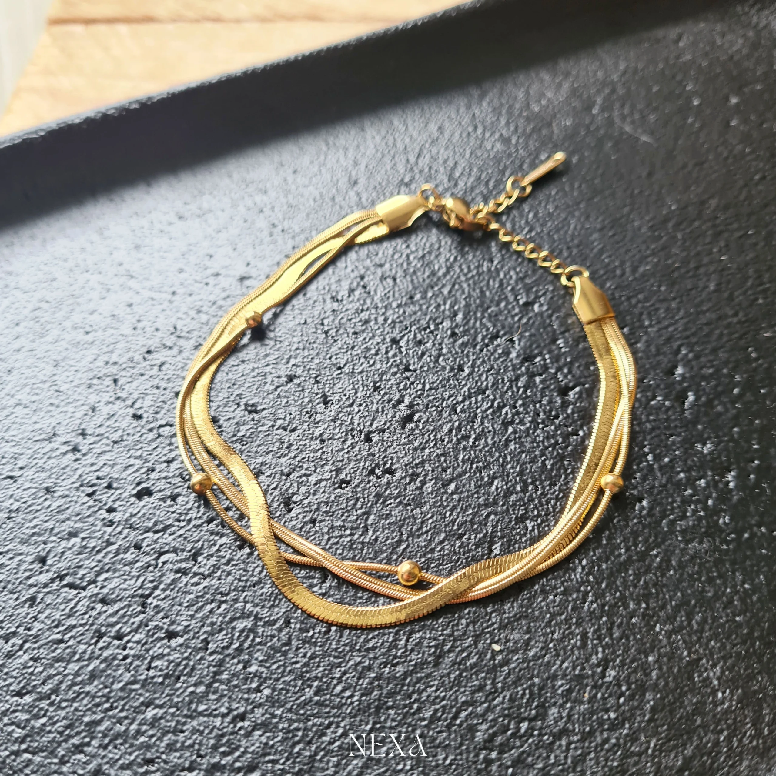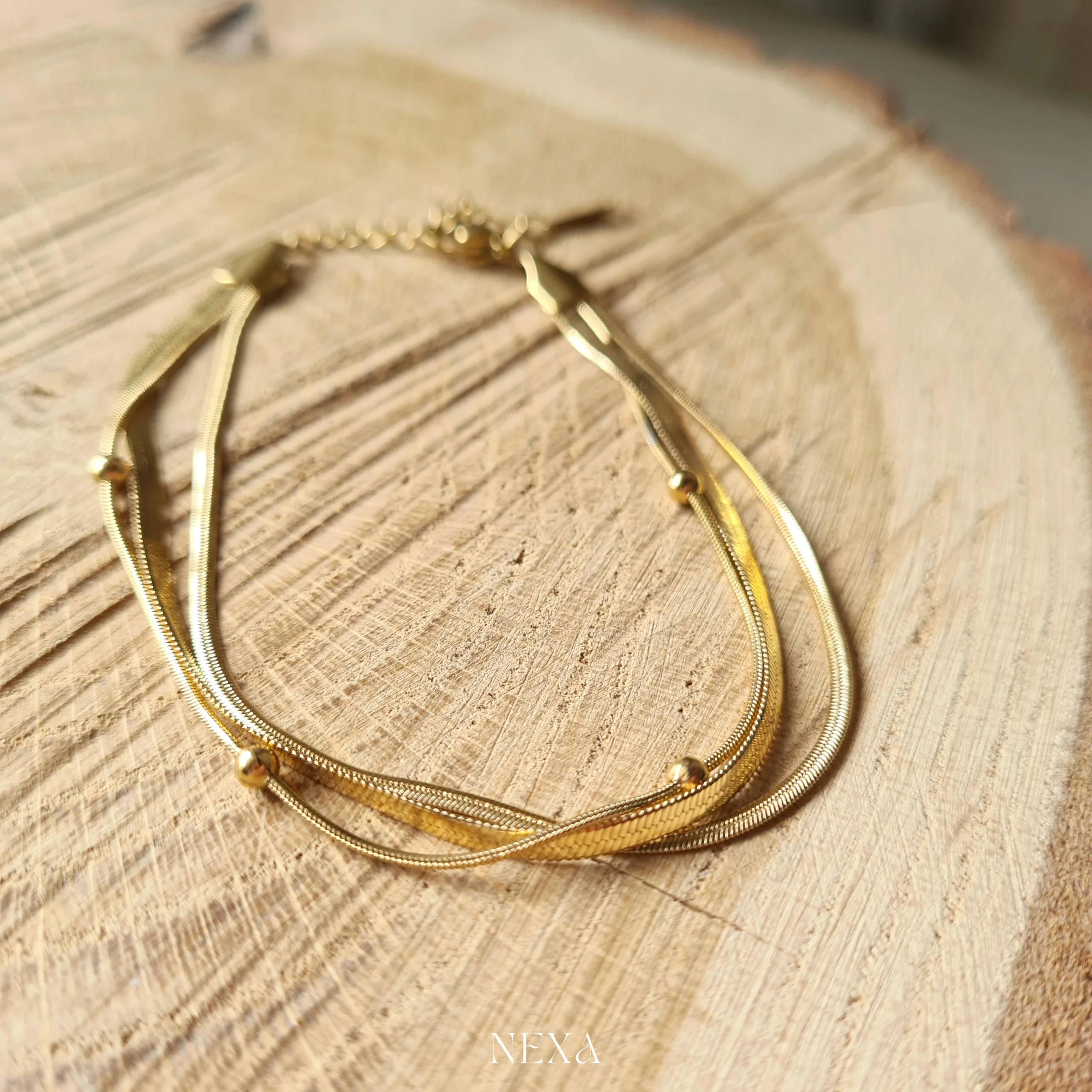 Trzy delikatne łańcuszki o różnorodnej strukturze układają się harmonijnie, tworząc wielowymiarowy, lekki efekt. Drobne złote kulki nadają bransoletce biżuteryjnej głębi i stylowego wykończenia, dzięki czemu przyciąga spojrzenia, nie dominując stylizacji.