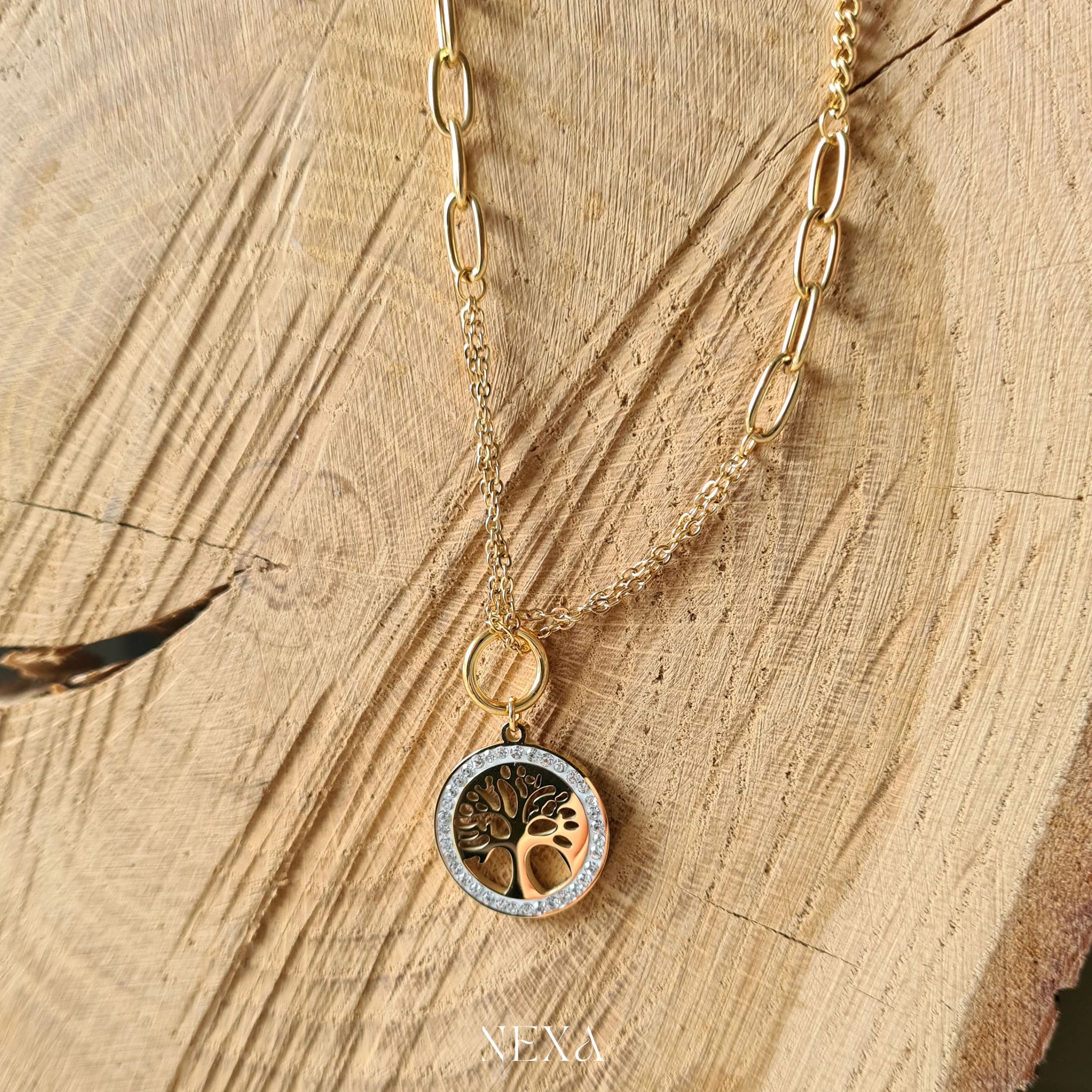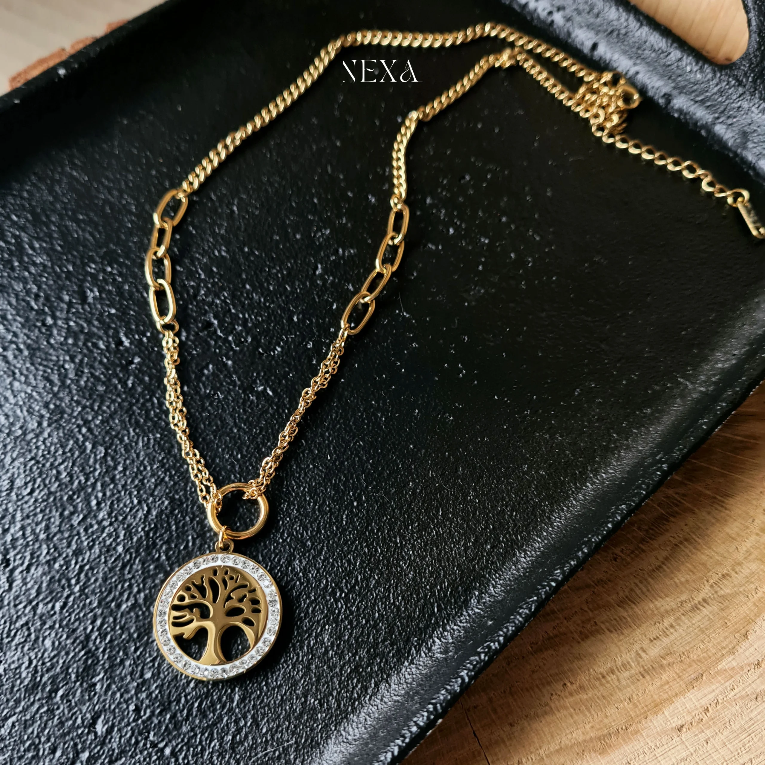 Naszyjnik wykonany jest z wysokiej jakości złotej stali chirurgicznej 316L, odpornej na wodę, przebarwienia i codzienne użytkowanie. Ażurowa zawieszka z motywem Drzewa Życia została otoczona błyszczącymi cyrkoniami, które subtelnie odbijają światło, nadając całości luksusowego charakteru.