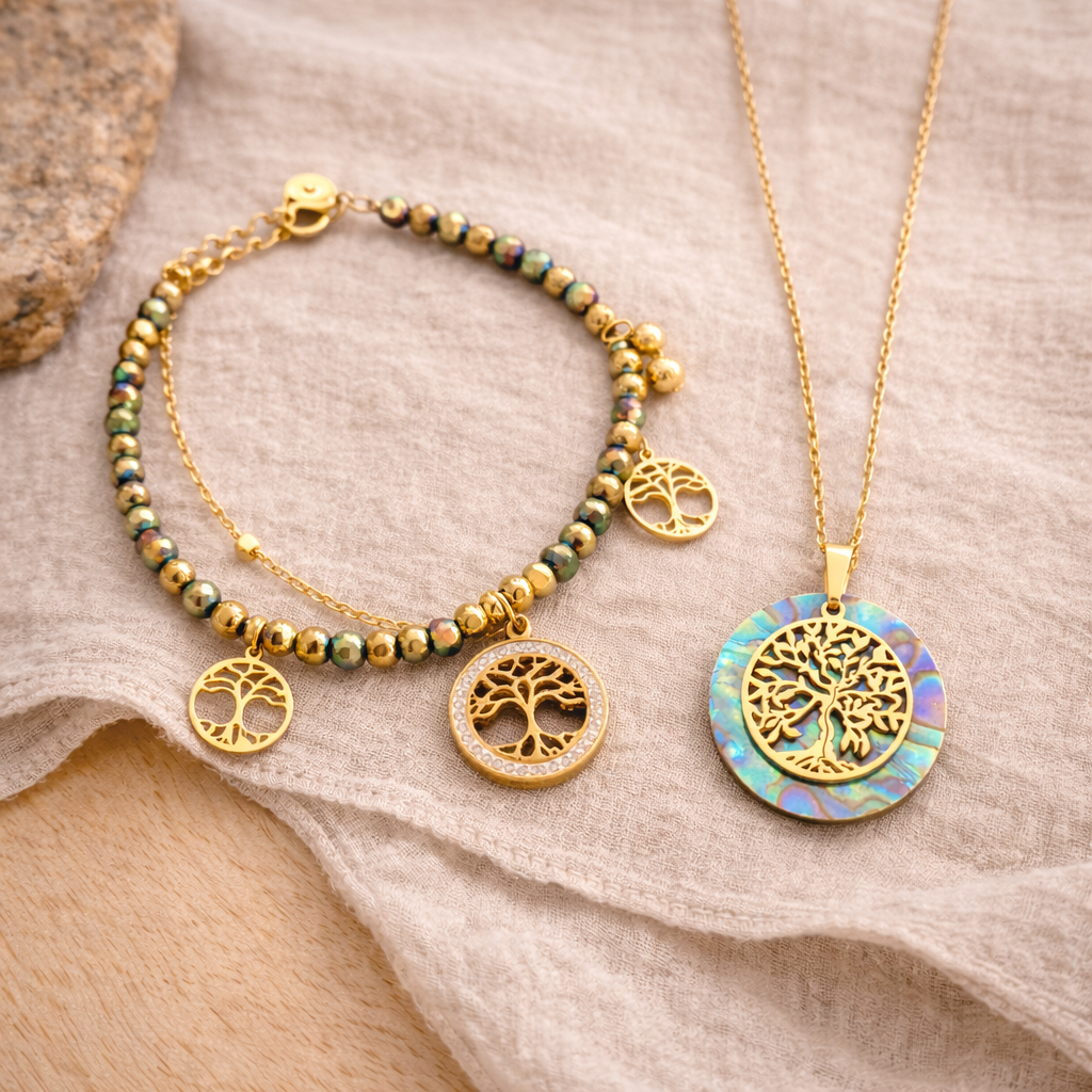 W skład zestawu wchodzi naszyjnik z okrągłą zawieszką oraz bransoletka zdobiona połyskującymi koralikami, uzupełniona delikatnymi zawieszkami w formie drzewa życia. Złote wykończenie pięknie współgra z opalizującymi akcentami, które subtelnie odbijają światło i nadają całości wyjątkowego charakteru.