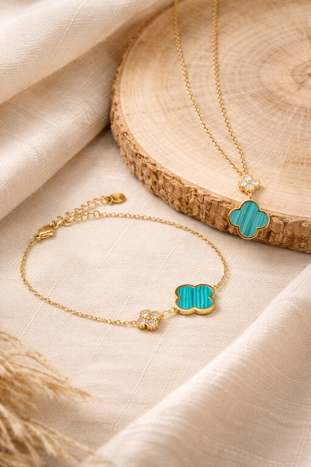 Elegancki zestaw biżuterii „Turkusowa Koniczyna” to wyjątkowa propozycja dla kobiet ceniących subtelny blask i ponadczasowe symbole. Motyw czterolistnej koniczyny, kojarzony ze szczęściem i dobrą energią, został połączony z intensywnym turkusowym kolorem oraz złotym wykończeniem, tworząc harmonijną i stylową całość.